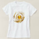 A women's basic t-shirt featuring a golden sun shaped piece of art art with abstract swirls around it.