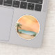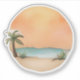 This peaceful watercolor artwork captures a golden sunset casting its warm glow over a serene beachfront. The sandy shore, accented by a graceful palm tree and lush greenery, creates a tranquil tropical escape. With its earthy tones and soft gradients, this piece is perfect for bringing a touch of the tropics to living rooms, bedrooms, or office spaces. Its circular design and minimalist aesthetic make it versatile for wall art, framed prints, or stickers.