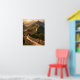 This artwork portrays the winding Great Wall of China stretching across green hills under a golden sunset. Watchtowers punctuate the stone pathway as it follows the mountain ridges, evoking centuries of history and human endeavor. It celebrates the grandeur of ancient engineering and the harmony between architecture and landscape.