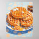 A mouthwatering digital artwork featuring a stack of golden, crispy waffles drenched in rich, flowing syrup and topped with creamy butter. The warm tones of the waffles contrast beautifully with the soft blue floral background, adding a cosy yet elegant touch. A slice of fresh orange enhances the composition, making this piece a perfect celebration of breakfast indulgence and food artistry.
