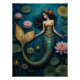 Dive into the mesmerizing depths of Golden Tides , a jewel-toned ocean scene inspired by Klimt’s signature gold spirals and mosaics. A mermaid adorned with intricate geometric patterns swims gracefully among lotus flowers, her tail shimmering with iridescent blues and emerald greens. Rich metallic accents contrast with soft ripples in the water, adding fluidity and movement. The composition radiates luxury, symbolism, and ethereal beauty.