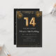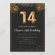 Adorable 14th birthday party invitation in a black and gold balloons design with golden tropical palm leaves. Customize with your party details and mail out to family and friends inviting them to celebrate the 14th birthday with style!