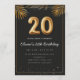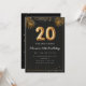 Adorable 20th birthday party invitation in a black and gold balloons design with golden tropical palm leaves. Customize with your party details and mail out to family and friends inviting them to celebrate the 20th birthday with style!