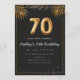Adorable 70th birthday party invitation in a black and gold balloons design with golden tropical palm leaves. Customize with your party details and mail out to family and friends inviting them to celebrate the 70th birthday with style!