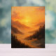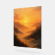 This is a breathtaking landscape painting depicting a mountain valley bathed in the intense, radiant light of a sunrise or sunset. The sky is dominated by a brilliant golden and orange glow, radiating from the central sun and illuminating the scattered clouds. The scene features deep, forested slopes on either side, their silhouettes providing a dramatic contrast against the vivid sky. A thick, ethereal mist or fog fills the valley floor, creating a sense of depth, mystery, and tranquillity. The style is highly atmospheric and evokes the grandeur of nature, suggesting a traditional or Romantic realism approach to painting.