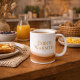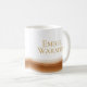 Radiant warmth theme in crisp white with a warm brown horizontal sweep and refined gold serif lettering reading Ember Warmth. This modern neutral accent suits morning coffee rituals, desk styling, or kitchen shelf displays, pairing effortlessly with taupe, wood, and cream interiors for a grounded everyday setting.