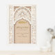 Usher your guests into your Nikah ceremony with this majestic welcome sign, adorned with the elegance of Islamic architecture. It features a golden arch that beautifully frames the welcoming script, while intricate arabesque patterns cascade down the sides, complemented by chevron columns. The design's colour palette of gold, cream, and ivory sets a luxurious tone, as the card reflects the light, creating a shimmering effect that captures the essence of your special day. Perfect for greeting guests at the venue entrance, this sign is not only a guide but a piece of art that enhances the celebratory atmosphere.