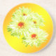 Pictured on a golden yellow background are yellow daisies with orange centres