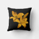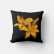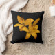 This throw pillow features a simple design of two golden yellow Asiatic lilies against a pure black background. The image is repeated on the back.