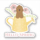 Cartoon illustration of a Goldendoodle popping out of a watercan filled with flowers. Perfect for summer and spring!