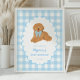 Welcome your guests in the sweetest way with this golden retriever first birthday welcome sign! Featuring an adorable golden doodle puppy with a blue gingham bow and matching checkered background, this personalized party poster adds the perfect touch of warmth and charm to your little one’s celebration.