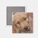 An adorable eleven week old Goldendoodle with bright eyes curiously peeks out from a doorway in a brick wall