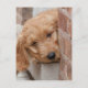 An adorable eleven week old Goldendoodle with bright eyes curiously peeks out from a doorway in a brick wall