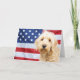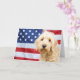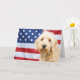 Goldendoodle sits proudly in front of the American flag on Memorial Day.
