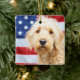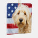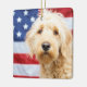 Goldendoodle sits proudly in front of the American flag on Memorial Day.