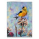 A bright gold and black American Goldfinch perches on a thistle bloom, with an abstract warm summer sky behind him. This is a reproduction of an original oil painting. Colours include gold, black, orange, and white for the bird, and lavender, blue, yellow, and green for the background. The thistle buds provide a bit of cranberry red, which contrasts nicely with the warm gold in the bird. Beautiful! The original painting is signed by the artist at the lower right. The inside of this card is left blank for your own message.
