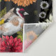 Hand-drawn goldfinches on bouquets of flowers and leaves- dahlias, chrysanthemums, calendula, coneflowers ivy and ferns