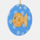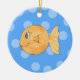 A cute swimming goldfish cartoon image on a blue pattern background.