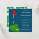 A simple illustration of a red golf flag, green and golf ball on a dark blue background features on this 50th Birthday Party Invitation. Use this card to celebrate your friend's, husband's, co-worker's, partner's, etc. 50th birthday with a game of golf followed by celebratory drinks and dinner. We added a golf-themed pattern with carts, clubs, balls, and flags to the back of the card and changed out the background colour. You can customise to your heart's content; even hide the pattern and add a photo if you prefer.
