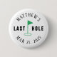 This custom button features the playful phrase "Last Hole" along with a golf flag image, making it a fun accessory for a golf-themed bachelor party. Personalise it with the groom's name and date for a unique and memorable touch. Ideal for the groom and his friends, this button adds a humourous and personal element to any pre-wedding celebration.