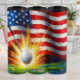 This dynamic illustration captures the moment a golf club strikes a golf ball, sending sparks and energy outwards. In the background, a large, stylised American flag waves proudly over a blurred green golf course, creating a powerful and patriotic sports image.