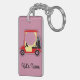 A red gold cart seen sideways, complete with bag and clubs, without people,