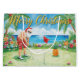 Full-scene modern watercolor illustration of Santa Claus golfing on a sunny Christmas day. He swings his club joyfully on a lush green golf course beside a turquoise sea lined with palm trees decorated with ornaments and fairy lights. Around him lie wrapped gifts, candy-cane golf tees, and festive flowers. The clear blue sky glows with daylight, and elegant gold watercolor script across the top reads “Merry Christmas.” The entire composition is bright, lively, and fully painted edge-to-edge — no white space or sunset tones, just cheerful tropical holiday energy.