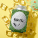 White golf ball with "par-tee" text and golf club on a green grass background.