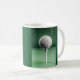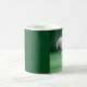 White and green coffee mug with image of a white golf ball on a white tee, set on a green background.