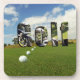 Pictured is a golf course with golf balls, and a golf logo layered over the top that was made with a golf clubs image.