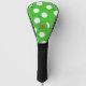 Fun personalised golf club head cover, with a colourful pattern of golf balls, holes and tees on a green grass background. Add your own initials to personalise.