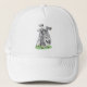 This all white hat features a stylish grey watercolor golf bag filled with clubs, sitting on a patch of green grass. The design includes a simple serif initial monogram placed right on the bag, making it feel like a natural part of the artwork. The letter is shown in a dark grey, almost black, to match the bag’s accents, but you can change it to any colour you prefer.