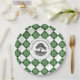 A stylish, round party plate perfect for a golf-themed event at a resort. The plate’s background features a classic green and white argyle pattern, evoking a preppy, golf-inspired look. In the centre of the plate, the resort’s logo is prominently displayed, giving it a professional yet celebratory feel. The logo stands out, surrounded by the clean, crisscrossing lines of the argyle, making it a focal point. The plate’s overall design combines elegance with a playful golf theme, setting the tone for a refined yet fun resort gathering.