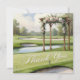 Show your appreciation with this elegant Golf Wedding Thank You Card. Featuring a serene golf course backdrop, the card includes a putting green, sand bunker, and water hazard, with a wooden wedding arbor adorned with beautiful floral arrangements. The words 'Thank You' are delicately crafted in cursive, as if cut from the grass, adding a personal and unique touch. This watercolor-style card captures the beauty and tranquillity of a golf course wedding, perfect for expressing your gratitude to guests.