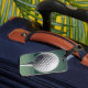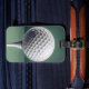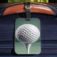 Luggage tag with a high quality image of a white golf ball on a white tee in front of a green background.