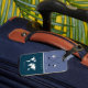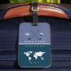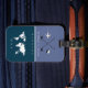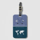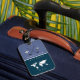 A nice and blue luggage tag for a golf player... his name, a small aeroplane, golf clubs, the map of the world...