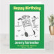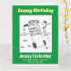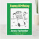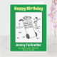 Funny cartoon of a golfer playing golf on a golf course. His golf cart has a sign which says, "How's my Driving?". Funny golf cartoon card idea for a golfer.