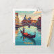 A gondolier steers a gondola with passengers through a Venetian canal, with ornate buildings and a bridge in the background.