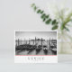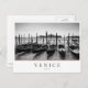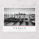 Photo postcard of a row of traditional gondolas in the water with Venice in the background in Italy in black and white with the text 'Venice, Italy' in a white box and with stripes in green, white and red, the colours of the Italian flag.