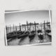 Photo postcard of a row of traditional gondolas in the water with Venice in the background in Italy in black and white with a white edge and the text 'Venice. The image is a bit rotated to create the illusion of it laying loose.