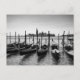 Photo postcard of a row of traditional gondolas in the water with Venice in the background in Italy in black and white.