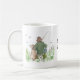 A white mug with a man fishing on a riverbank and his dog beside him, watching the dragonflies. See also matching cap, T-shirt, tote bag and birthday card.