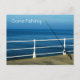 Photograph of a fishing pole leaning on railing on fishing pier. Customisable text.