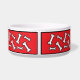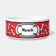 Funny dog food bowl with a pattern of dog bones against a bright red background. Add your dog's name.
