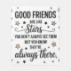 Celebrate the enduring bond of friendship with this beautiful quote design. Featuring the heartwarming message, "GOOD FRIENDS are like stars you don't always see them BUT YOU KNOW THEY'RE always THERE," this design is accented with charming star illustrations. Perfect for expressing appreciation for your friends, this versatile design is ideal for prints, cards, gifts, or home decor items. Share this sentimental reminder with your closest companions or add a touch of warmth to your own space. It's a lovely way to honour those special connections that shine bright, even when far away.