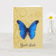 Design of a beautiful, large, midnight blue monarch butterfly against a vintage floral style background with Good Luck greeting. This art design shows the natural vibrant colour of the butterfly and has retro vintage feel.