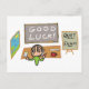 Offer some encouragement when exams come around with this Good Luck Exams cartoon message. For poor student test takers - a little humour to lighten the load. Shows classroom, blackboard with message, "keep quiet" notice board, student at desk and a beautiful day outside.