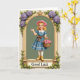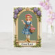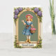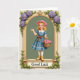 This card design shows a young blonde girl standing in the center of an ornate gold arch, like a page from an old storybook, with a gentle, friendly gaze that feels like she’s greeting someone she cares about 💚. She wears a soft pink straw hat and a cerulean blue dress with a white collar and lace along the hem, and a warm brown ribbon ties at her waist. In her arms she cradles a woven basket overflowing with pink roses, and her raised hand adds a tender, welcoming gesture. The arch is detailed with gold flourishes and clusters of purple hydrangeas mixed with rich green leaves, with vines trailing down toward the base ☘️. Inside the arch, the background is a muted sage green that makes the flowers and her blue dress stand out. Near the bottom, a banner stretches across the frame with the words “Good Luck” set in a classic serif style, colored to read clearly against the banner. Gold edging, purple blooms, and curling greenery frame her from top to bottom, with the banner centered at the base of the arch.