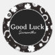Good luck sticker with black and white lucky pattern design with four leaf clover, shamrock, horseshoe, dice, eight ball. They feature a cute customizable text and image. Perfect for invitations and party bag goodies.
