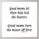 Funny design reads, in black letters,"Good moms let their kids lick the beaters. Great moms turn the mixer off first." Great for a laugh and those with a good sense of humor or humour. Terrific gift for any kid, old or young on a birthday, at Christmas, Kwanzaa. Great for mom on Mother's Day, too.